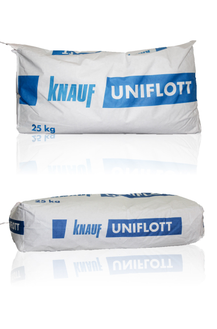 Knauf Uniflott ist ein pulverförmiges Spachtelmaterial und es basiert auf einem kunststoffvergüteten Spezialgips, der durch Zusätze auf seine Anwendungsbereiche abgestimmt ist.